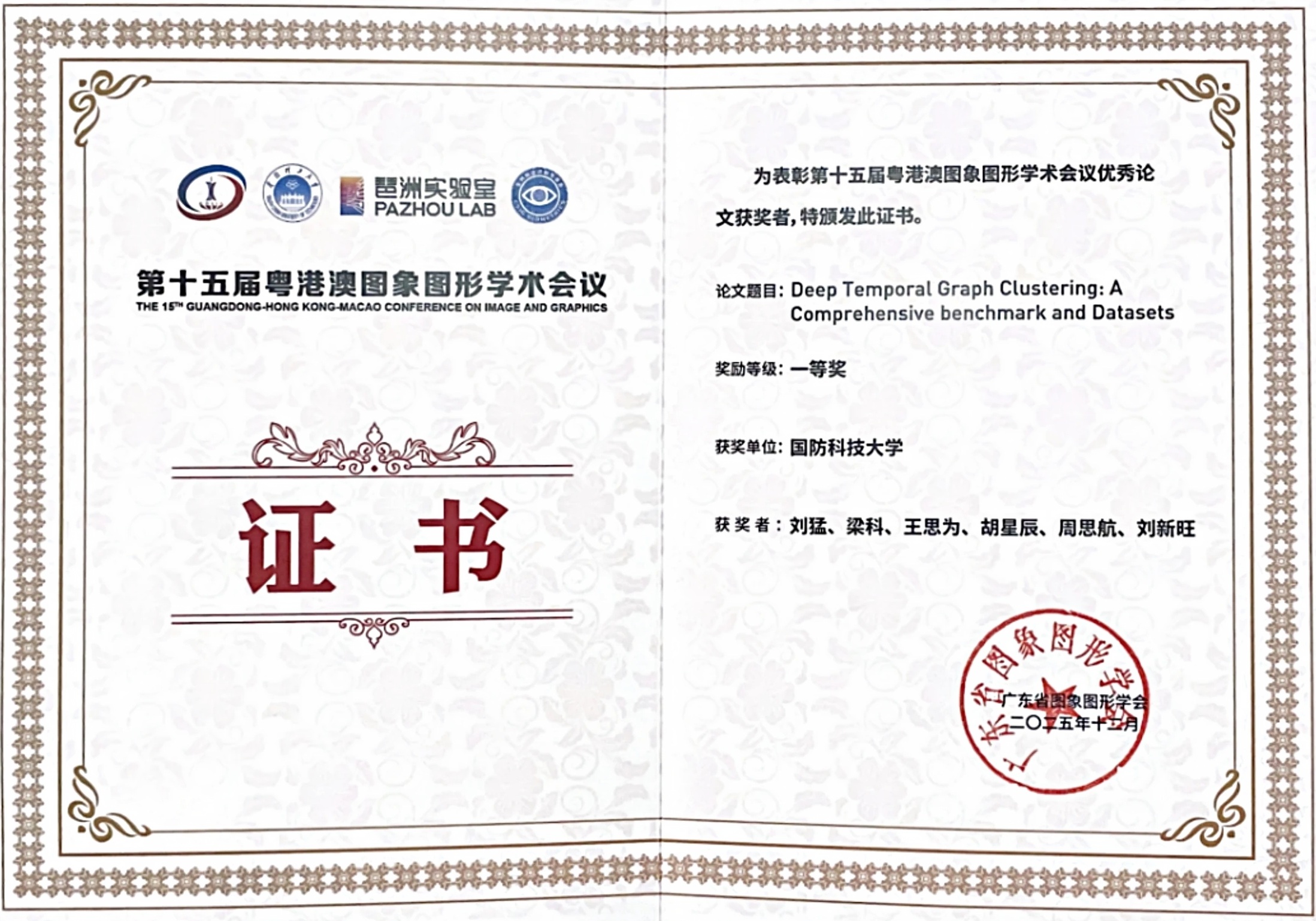 Excellent Paper of The 18th Hunan Province Postgraduate Innovation Forum ) - [J] Meng Liu, Ke Liang, Siwei Wang, Xingchen Hu, Sihang Zhou, Xinwang Liu. Deep Temporal Graph Clustering: A Comprehensive benchmark and Datasets. IEEE Transactions on Pattern Analysis and Machine Intelligence, TPAMI. (一区Top, IF=18.6, CCF A,