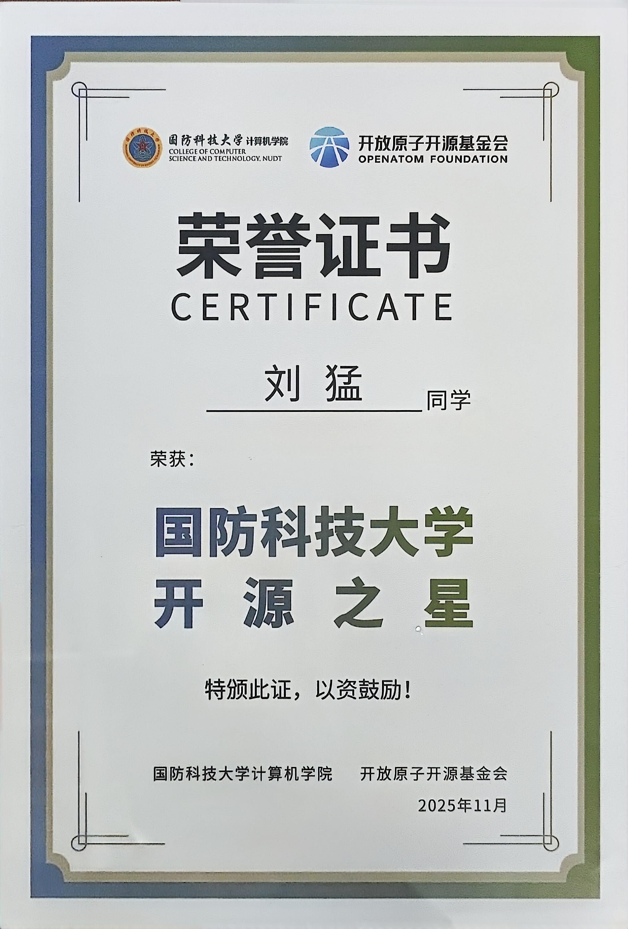 - 2025, Open-Source Star (10 People University-wide), Openatom Foundation & NUDT. [Award]