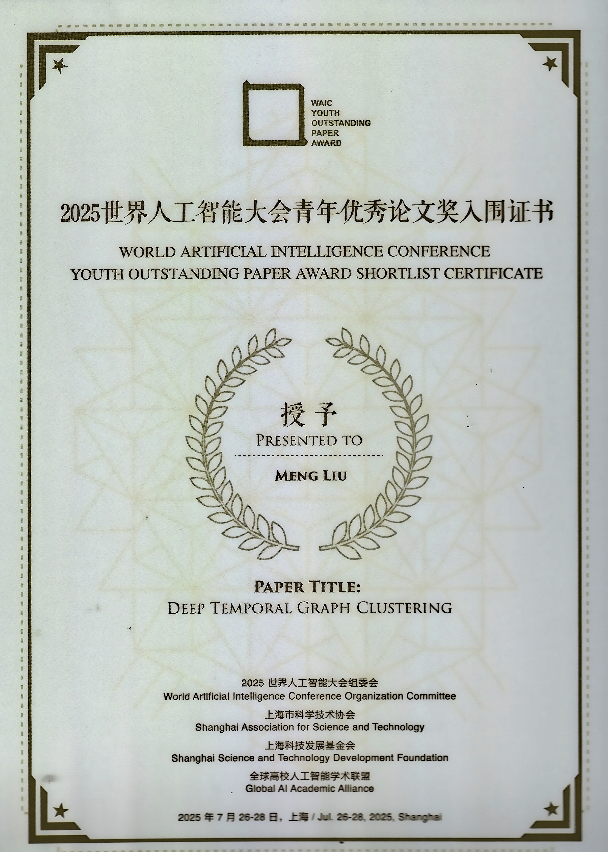 2025, DAAD AInet Fellowship (18 People Worldwide in 2025). [News]2025, Youth Outstanding Paper Shortlist (40 Papers Worldwide, First Author), WAIC. [Award]2025/2024/2023/2021, China National Scholarships * 4. - 2025, De Ya Student (德雅学子), National University of Defense Technology.
